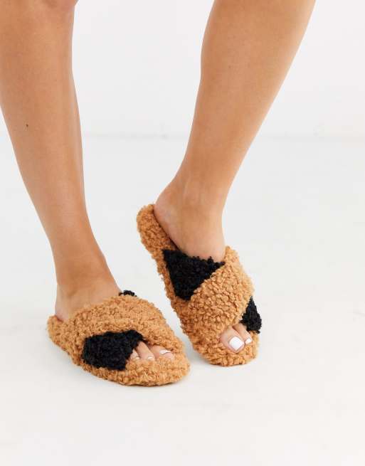 ASOS DESIGN Neve cross strap slider slippers in tan and black borg