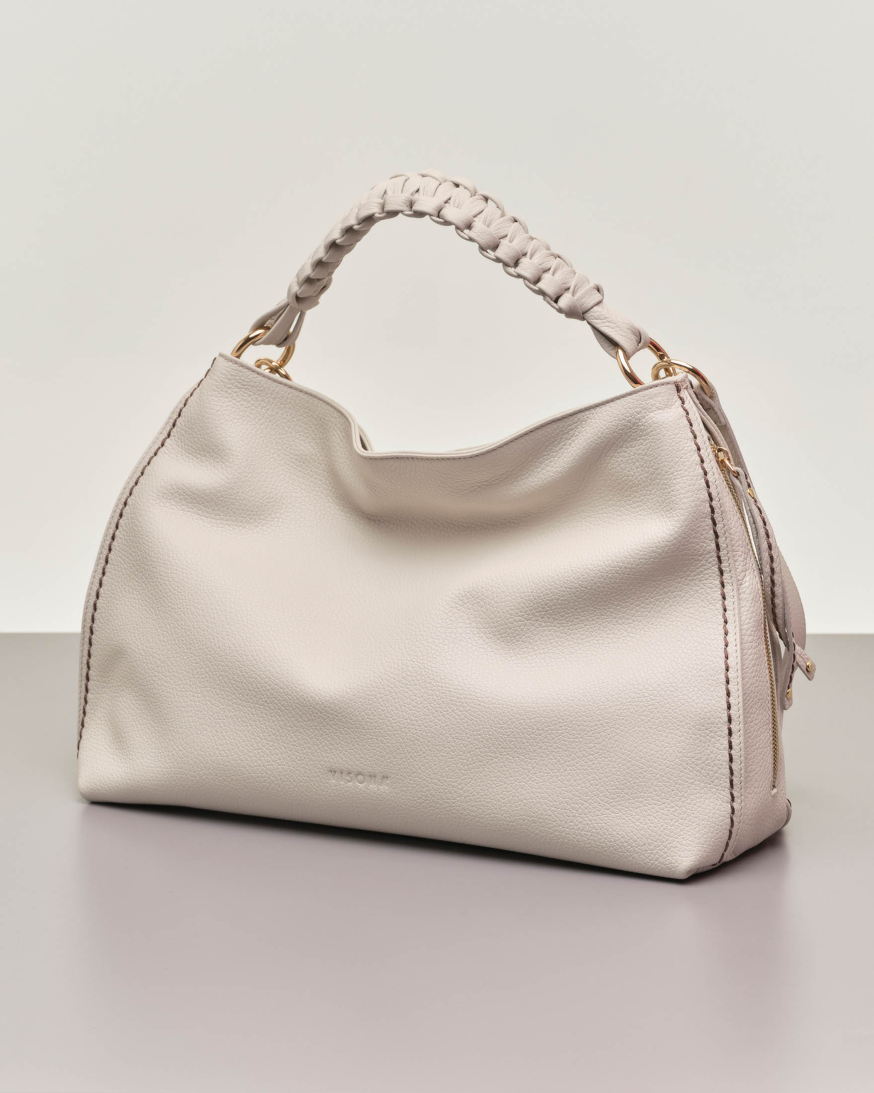A spalla 2025, Borsa a spalla color avorio in pelle martellata con manico 2025