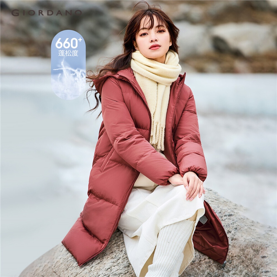 GIORDANO WOMEN Solid color mid long hooded duck down jacket 13372871