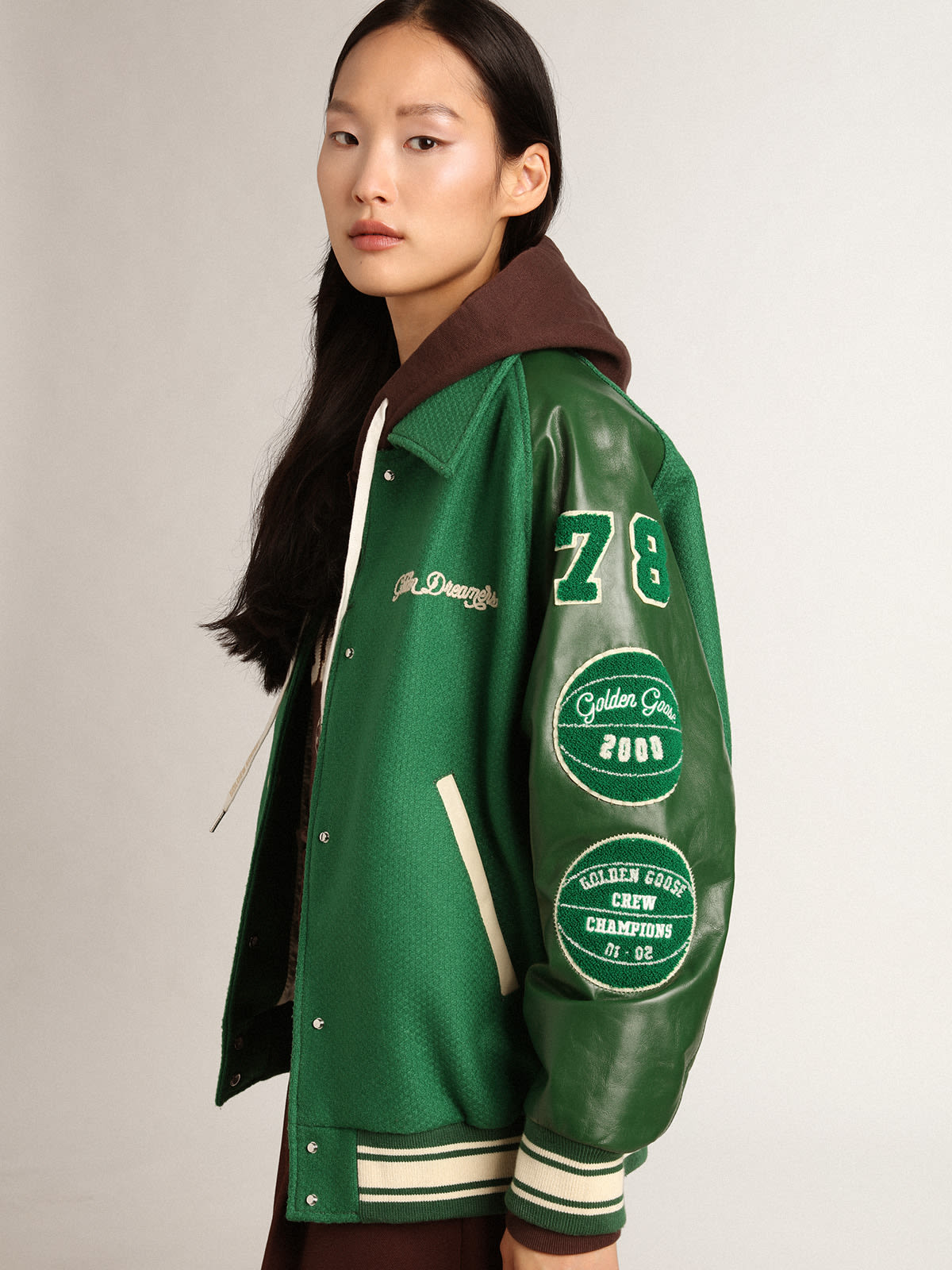 Golden goose bomber jacket 2025, Men s bomber jacket in dark blue wool with leather sleeves 2025