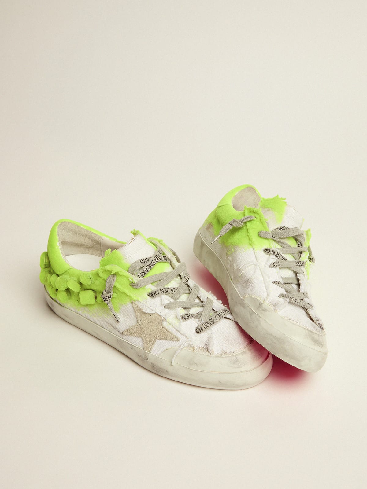 Super Star sneakers in white canvas with crystals and fluorescent yellow flock paint