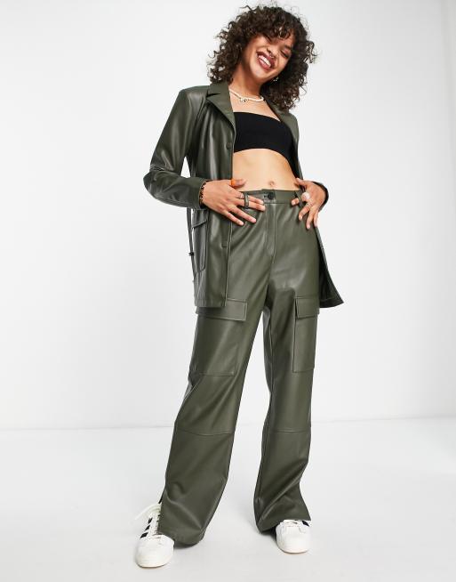 JJXX utility faux leather cargo pants in dark green part of a set