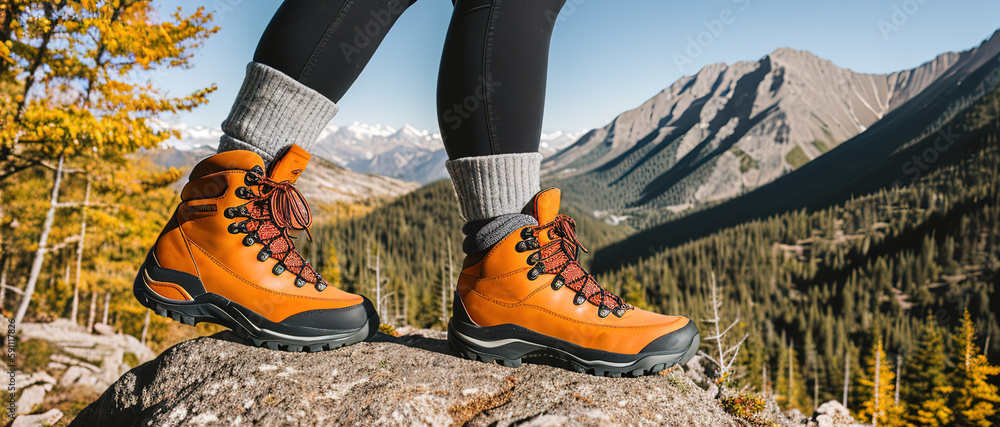 Close up of the trekking shoes of a hiker crossing a mountainous