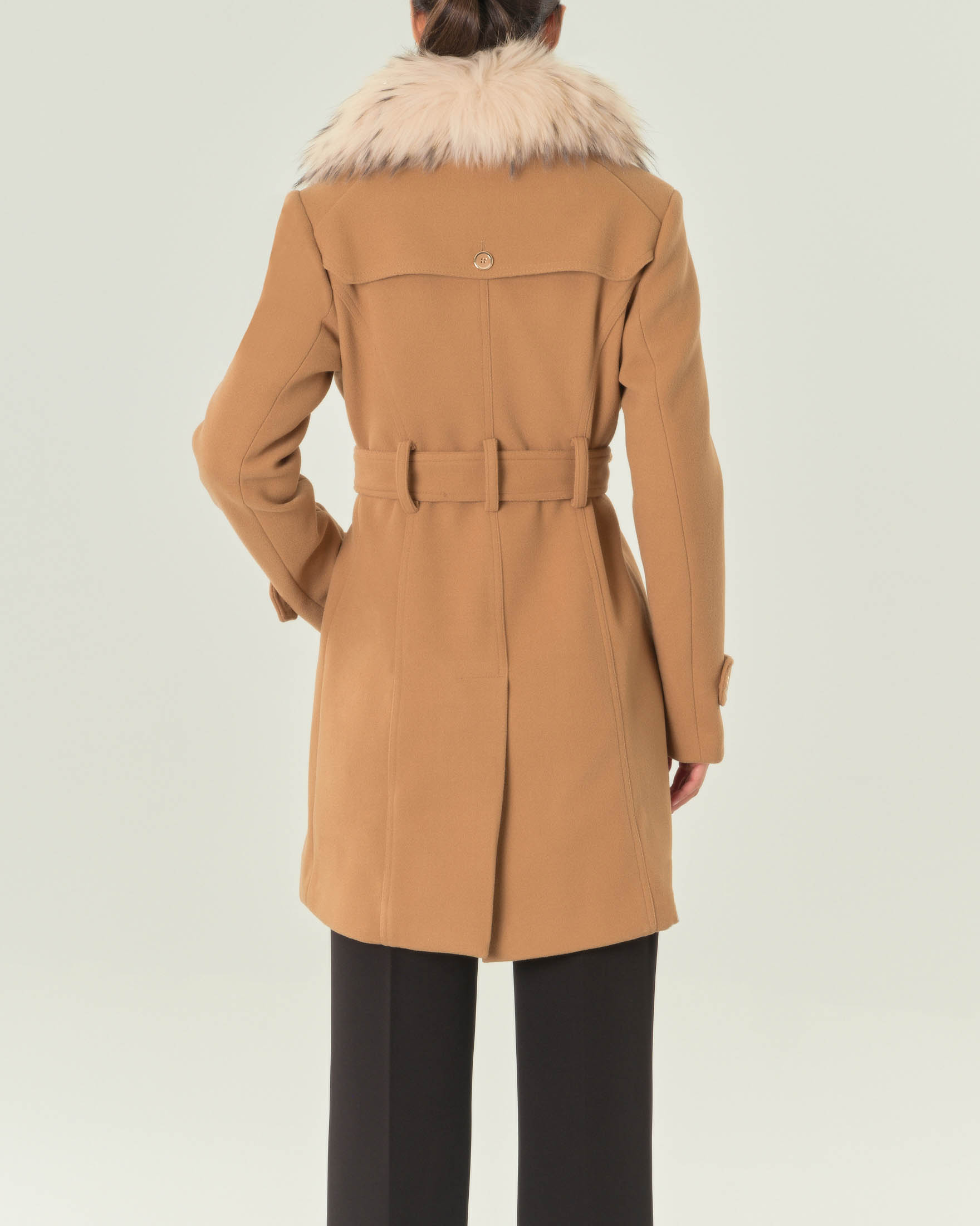 Cappotto doppiopetto color cammello con collo in pelo sintetico
