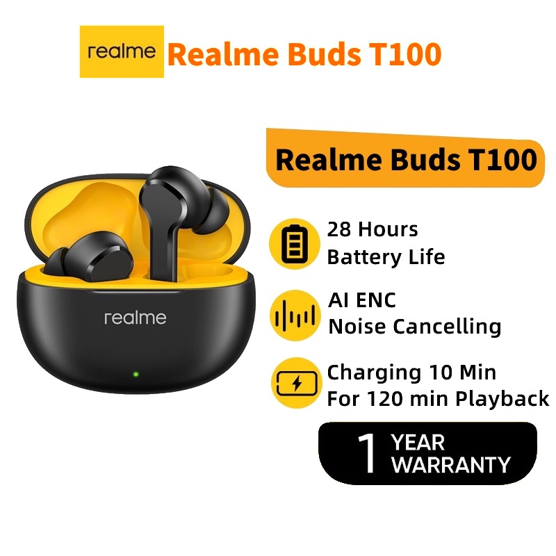 Original Realme Buds T100 5.3 Bluetooth Earphone AL ENC Noise Cancelling for Calls 400mAh Battery Earbuds IPX5 Water Resistant Headphone