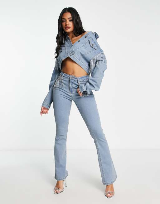 Fae cropped denim trucker jacket with diamante fringe in washed blue