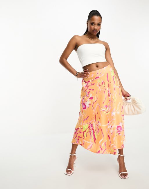 Vero Moda Petite satin midi skirt in orange abstract print ASOS