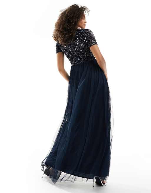 Maya Bridesmaid Vestito lungo da damigella in tulle blu navy a maniche corte con paillettes delicate tono su tono