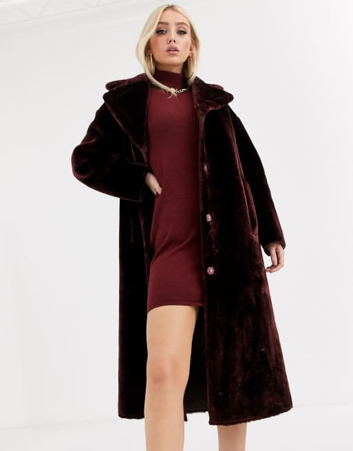 ASOS DESIGN plush faux fur maxi coat in burgundy ASOS