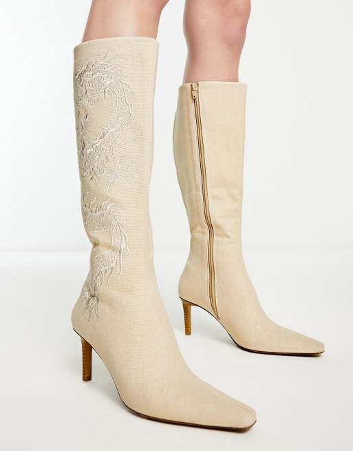 ASOS DESIGN Chai dragon embroidery knee boot in off white ASOS