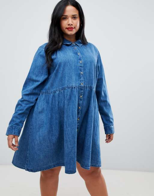 ASOS DESIGN Curve denim smock dress in midwash blue ASOS