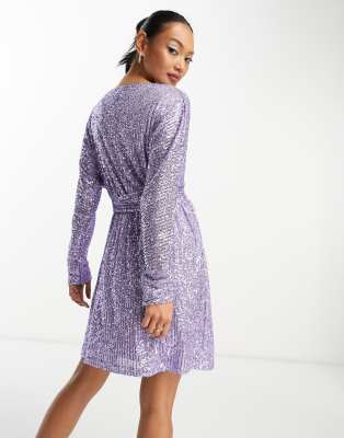 ASOS DESIGN sequin wrap mini dress with belt in lilac