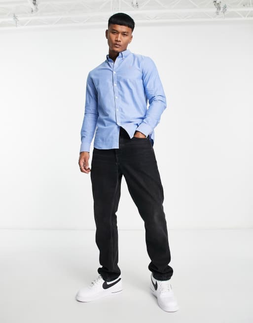 Farah brewer long sleeve slim fit cotton shirt in mid blue ASOS