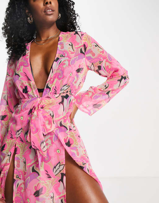 ASOS DESIGN tie front beach maxi beach kimono in bold floral print