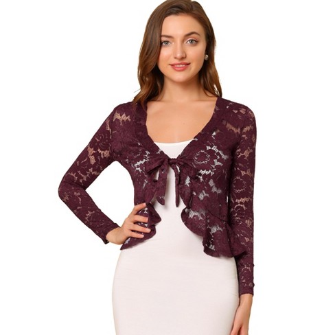 Allegra K Women s Tie Front Ruffled Hem Floral Lace Sheer Crop Shrug Burgundy X Large